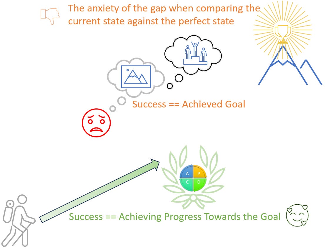 Due to the gap between now and the future perfect state, we can reduce a lot of energy drainage (waste), guilt, and disappointment (negative emotions) by redefining success as “the daily deliberate practice of continuous improvement to achieving the goal.” Note the subtle yet critical difference of changing from associating ‘achievement’ to ‘achieving’. Refocus on wanting the end goal (achievement) to engage with the process (achieving).